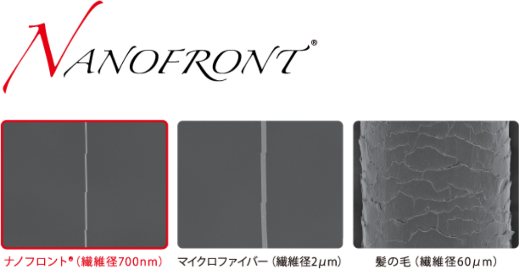 「より細くて強い繊維」を目指して、世界で初めて開発した超極細ポリエステル繊維「ナノフロント®」。その細さは、マイクロファイバーよりも細い直径700ナノメートル、1本の糸の断面積が髪の毛の7500分の1。このような細い繊維は、長繊維(一本の連続した繊維)の生産が困難ですが、私たちはこれまで培ってきた研究開発と生産技術を基盤に、独自の技術で開発・生産しています。さらに細いナノレベルのファイバーも生産が可能になり、 また、環境にも配慮し、リサイクル材料を用いたナノフロント®も展開しています。